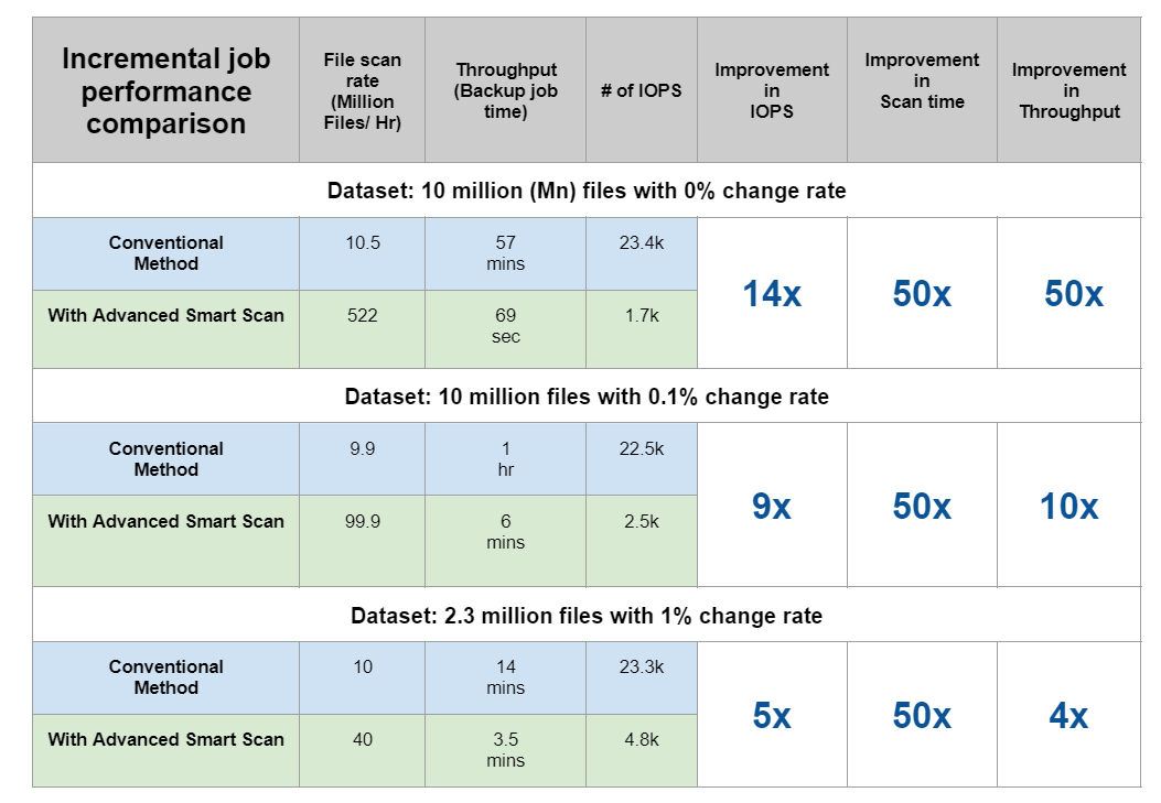 Traditional NAS incremental backup requires traversing through all the directories and files in a share configured for backup to track changes. Advanced Smart Scan uses a deterministic approach and performs file system scan very efficiently. It optimizes three aspects of the scan: