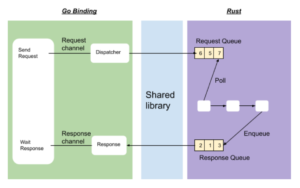 To mitigate this issue, we treated the Rust layer as a Remote Procedure Call (RPC) server and Golang layer as an RPC client. The interface is then modeled on RPC-style request/response. Each request, having a unique ID, will be enqueued to a channel. The other end of the channel dispatches requests to the Rust side. This dispatcher will actually call the Rust library API, which means a system thread will be spawned. However, in this case only one thread per dispatcher will be spawned.