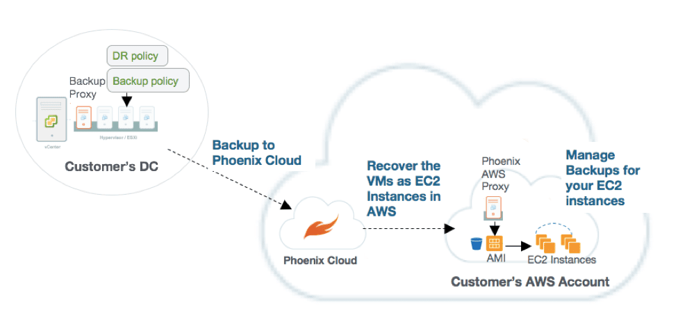 With Phoenix DRaaS, Amazon Machine Image (AMI) copies are created based on the VM backup and maintained in the AWS cloud. When a disaster strikes, you can launch an EC2 instance from these AMIs, which will spin up to production in minutes. The AMI copies are then updated with the latest VM backup based on the defined schedule.