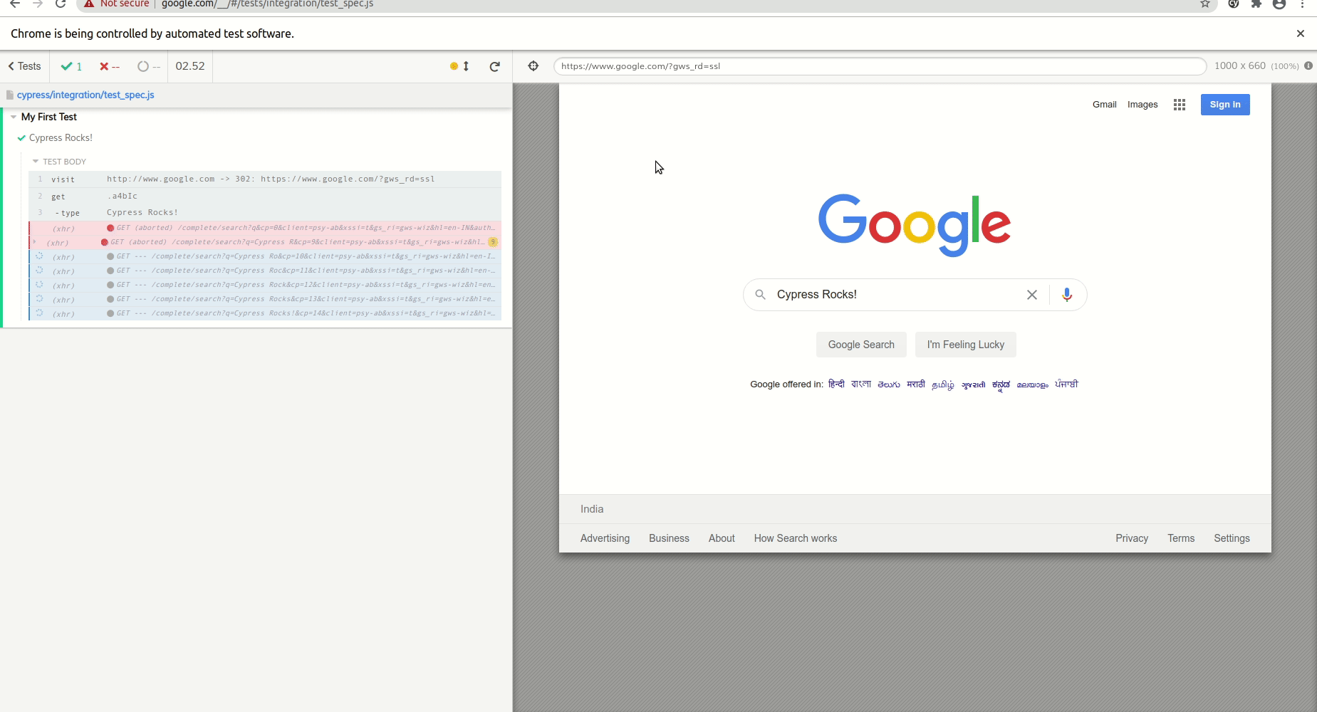 This test code will open the chrome browser and navigate to https://google.com/ and search for the keyword “Selenium Rocks!”