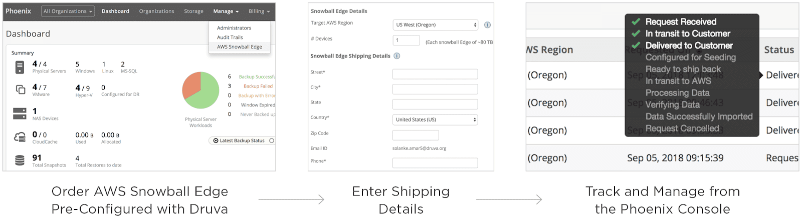 Zero customer cost—Load and ship! Is it that easy? Yes! Well, AWS Snowball Edge is integrated into the Druva Cloud Platform, for Druva Phoenix customers, allowing it to be offered at no additional cost, speaking to the benefit of an ‘as-a-service’ solution.
