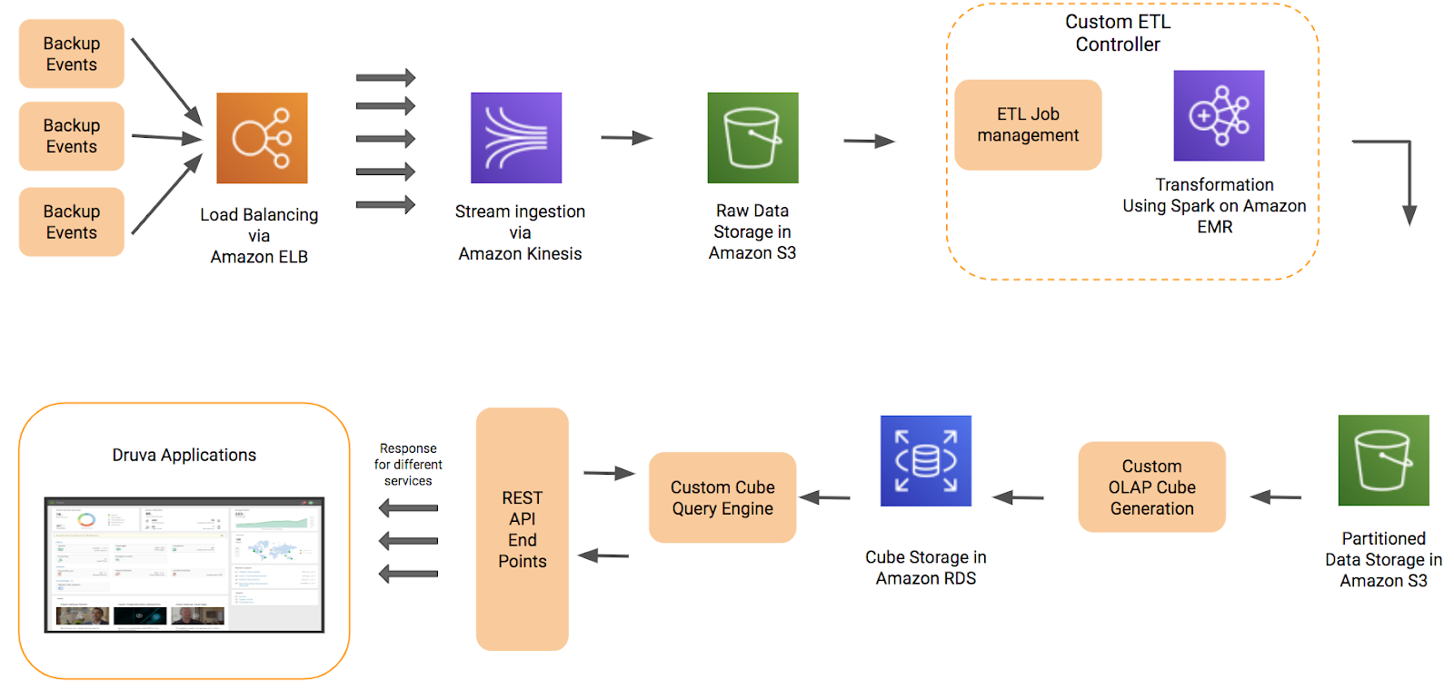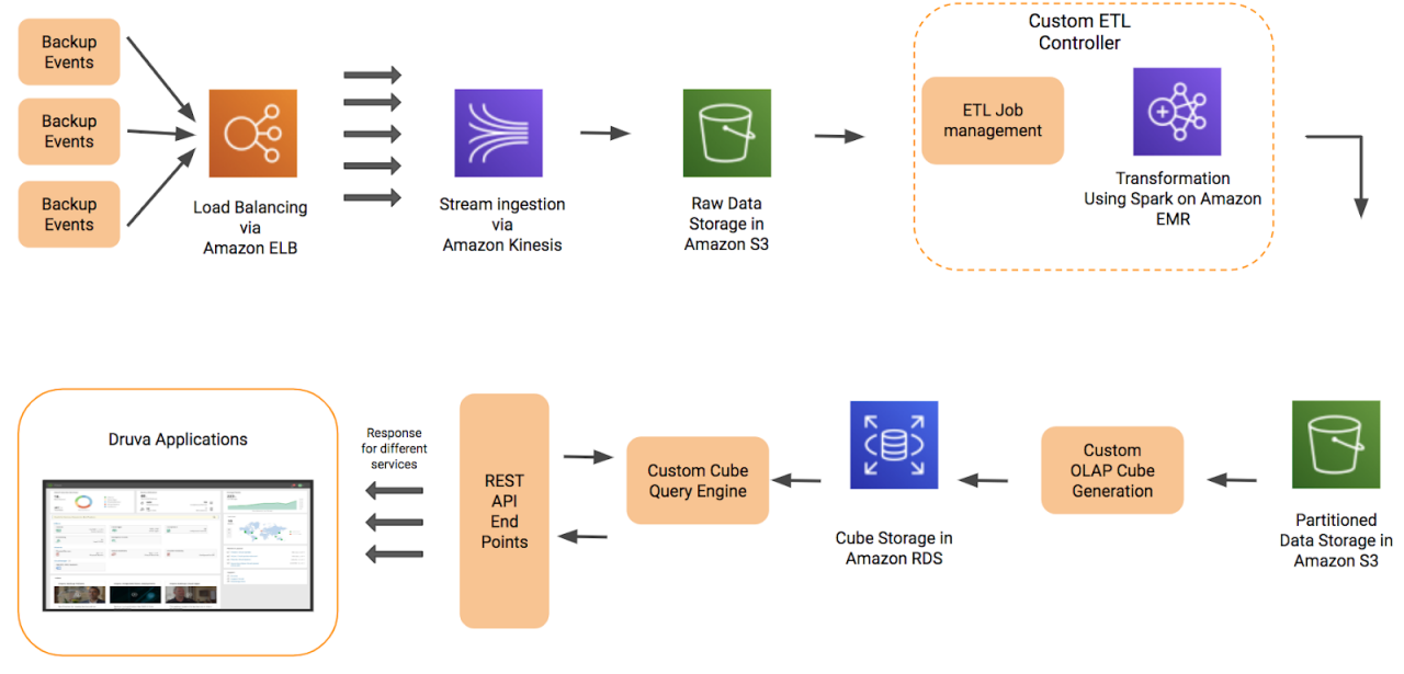 Conventional data management and querying techniques are not scalable enough to handle billions of backup events. While our competitors are confined to appliances and physical space, we live and thrive in the cloud. To transform backup event data into an asset, we built hyper-scalable, high performance big data analytics pipelines in the cloud. These pipelines ingest unstructured data about the billions of backup events and the utilization of the corresponding infrastructure and transform that for innovation into Druva products. One example is generating insights for compliance and eDiscovery.