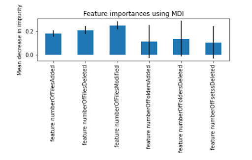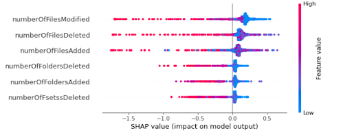In this sample dataset, there are 1,000 observations and many features, but for simplicity, here we selected only six top features. The features represent user activity detected during a backup, such as count of files added, count of files deleted, count of files modified, count of folders added, count of folders deleted, and count of files renamed. Our objective was to use these features as representatives of user activity and detect any unusual user behavior that could have been caused by human error, malicious intent, or a malware/ransomware attack on the system.