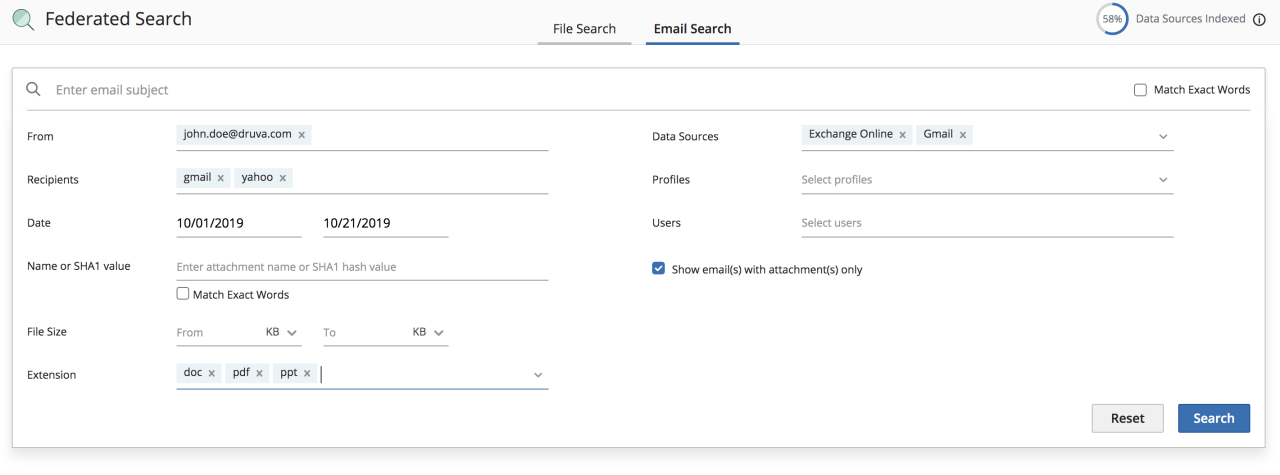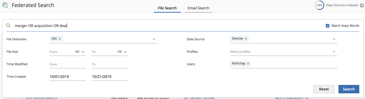 During investigations, working efficiently and quickly is the key. Druva’s search capability has been designed for the scale and diversity of a large enterprise. Druva’s federated search functionality collects data from multiple sources and provides results on a near real-time basis across multiple data sources in a single pane of glass. The data sources supported include, laptops, mobile devices, box folders, GSuite and Office 365. Some of Druva’s key capabilities to streamline search include: