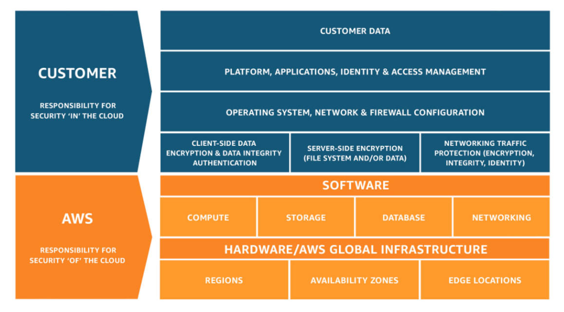 In the AWS shared responsibility model, customer responsibility is for the “security in the cloud.” As a customer, the headache of managing and protecting the infrastructure is no longer an issue — AWS takes care of that responsibility. However, the onus is on the customer to protect and back up all customer data, the platform, operating systems, applications, and providing or restricting all access management to its users.