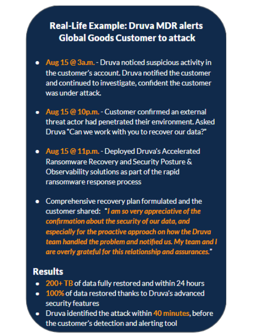 Yes, Druva’s Managed Data Detection and Response (MDDR) service IS that early warning solution! Druva MDDR provides threat detection services where Druva actively monitors the security posture of your backup environment, sends alerts to notify you of any potential issues, and assists with the incident response and recovery to accelerate your return to normal operations.