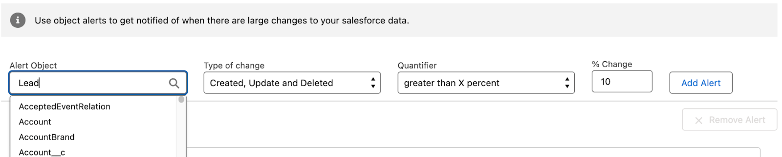Define alert conditions (e.g., trigger an alert if the Lead object sees a 10% or higher change in record count).