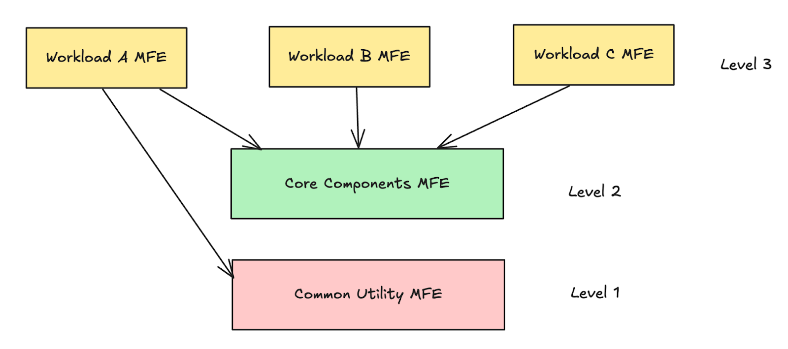 Level 3: The Workload Microfrontends Each business function or "workload" is developed as a separate microfrontend at this top level. These microfrontends are the consumers of the two lower-level microfrontends. They use the utility functions from the first level, and the UI components and business logic from the second level as building blocks. On top of this, they add their own functionalities to create the UI for their respective workload management sections.