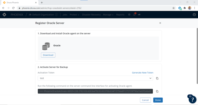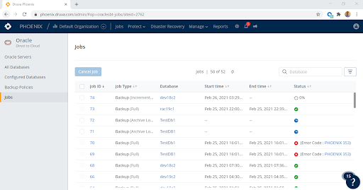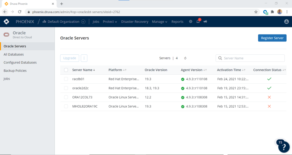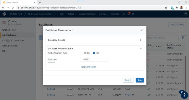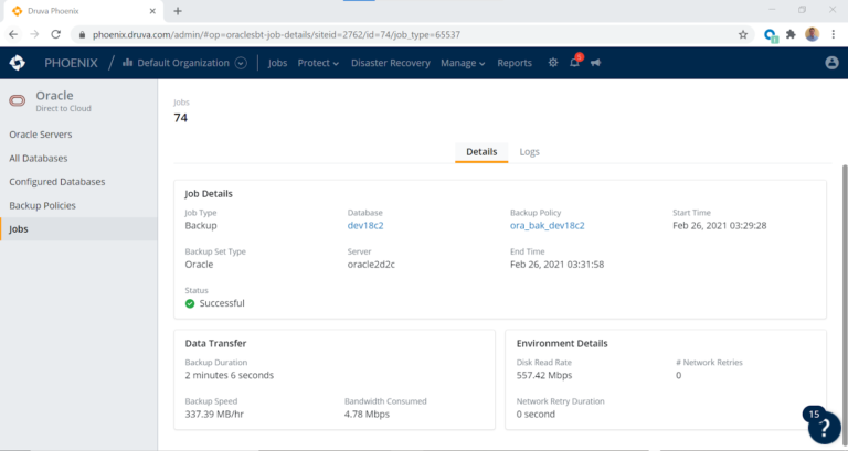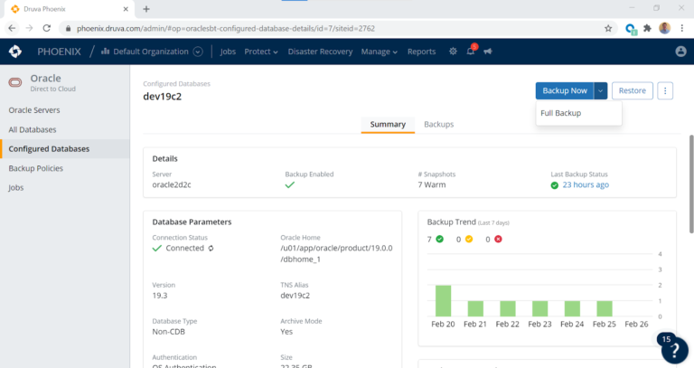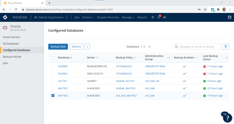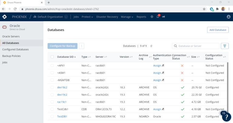 The Druva Phoenix for Oracle SBT tape library handles everything for the DBA and backup administrator. The library performs the deduplication, encryption, and compression of the RMAN-based backup. This greatly simplifies the backup process by removing any need for DBAs to worry about setting hard code RMAN parameters in their database configurations. The agent uses highly-secure certificates such that only the customer has access to their backups in the cloud. The SBT library directly streams Oracle RMAN backups into the Druva cloud and filesystem in the AWS EC2 environment. As such, the backups are not only compressed, encrypted, and deduplicated, they are also protected from any kind of ransomware attack. The backups transmitted to the Druva Cloud are encrypted in flight by the SBT library, and encrypted at rest in the Druva Cloud to ensure complete security and the integrity of your Oracle backup data. Once the SA, DBA, or backup administrator has completed the deployment of the agent and Druva proprietary code to the server, the rest of the work is done exclusively in the UI, including configuration of the databases. The UI makes this process simplistic with a short series of point and click operations.