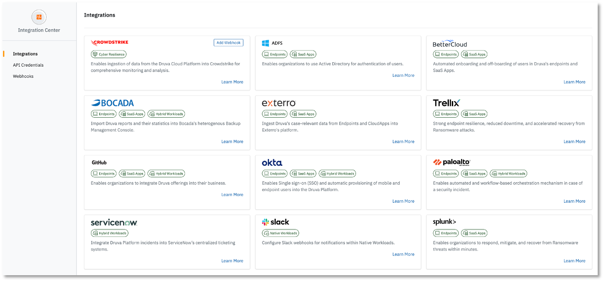 Out-of-the-box integrations supported by Druva