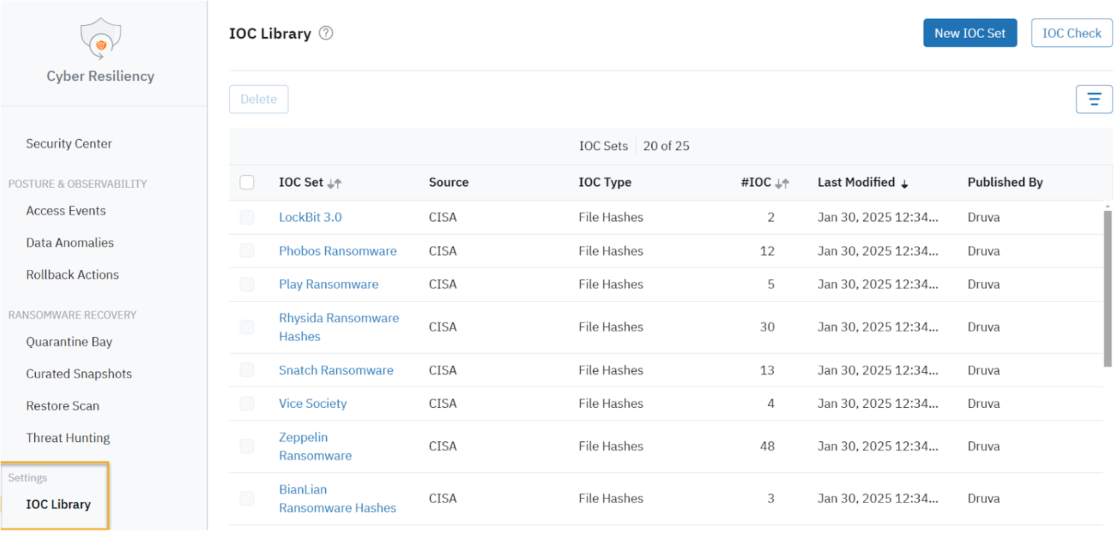 Trusted threat intelligence: Druva-published IOC Sets are sourced from widely recognized sources like CISA advisories and regularly updated for the latest threat coverage.