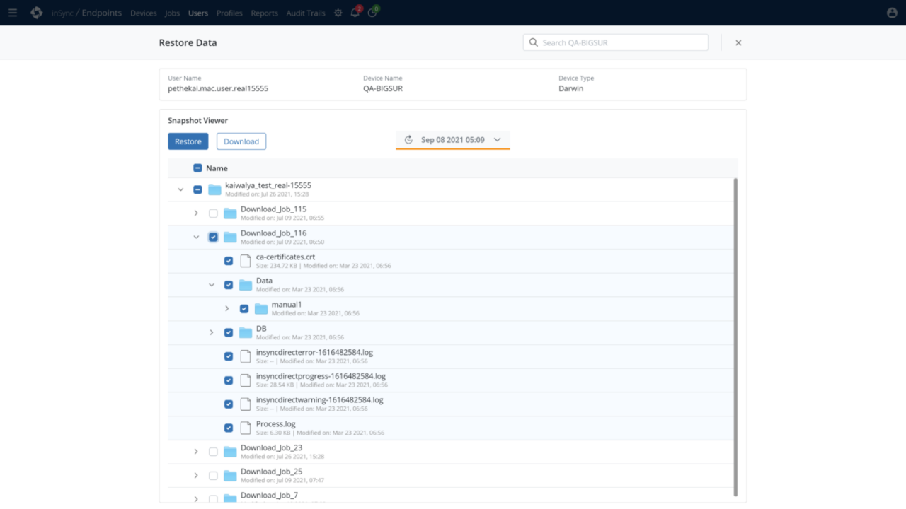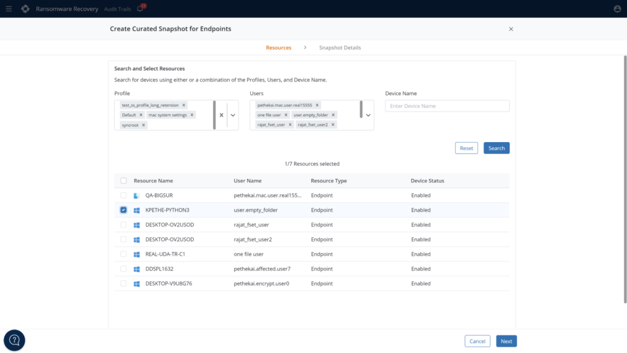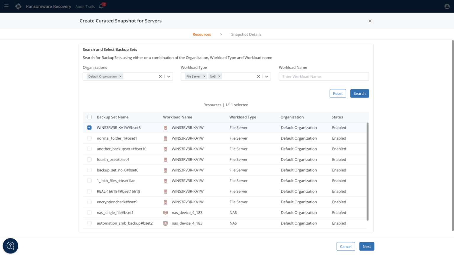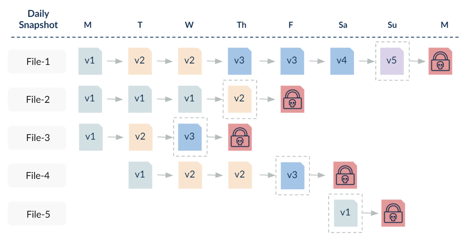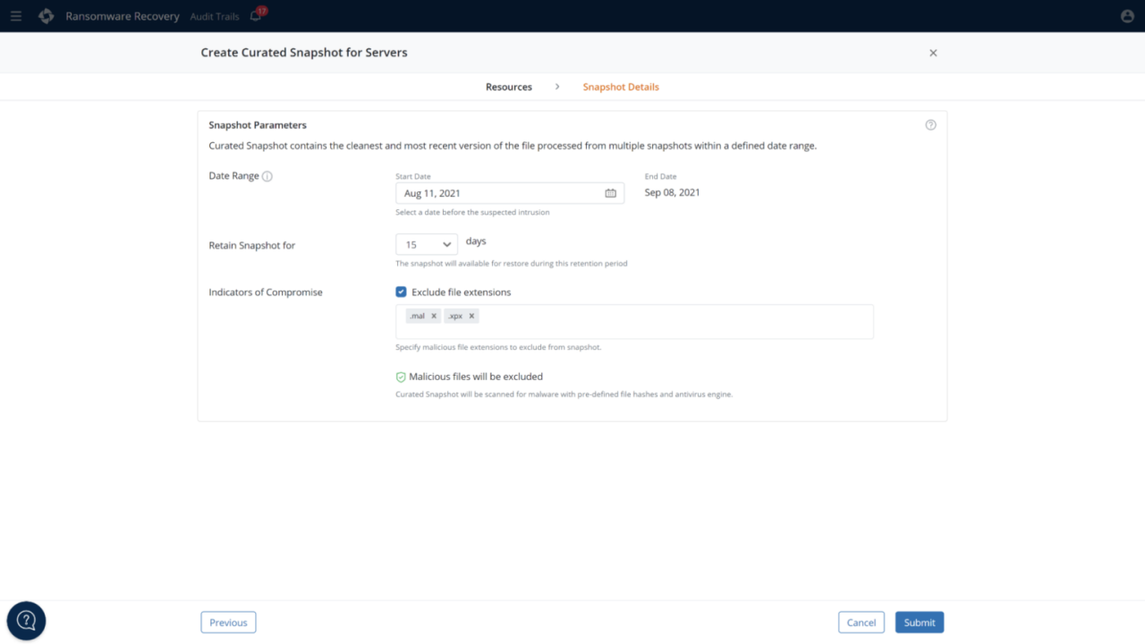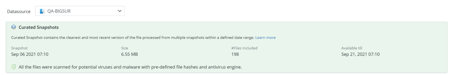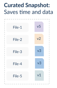 Curated recovery is a new feature that makes it easier to collate last-known good versions of files across numerous snapshots in a user-defined timeframe. This ensures that when you want to restore, you restore from a single backup and know that it’s comprehensive and clean. Refer to the diagram below for a closer look at this process.
