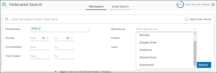 Your security team can search for specific static file IoCs. Backups can complement security tools to allow the customer to determine the infection, scope, and timeline, and help initiate the next steps of containment, cleanup, and recovery. Druva’s Federated Search is a powerful tool that leverages metadata of backups. This Federated Search capability is critical to enabling the location of sensitive or malicious data that is backed up by users and offers unique insights that go beyond the raw data itself. Admins can search for data based on the following criteria: