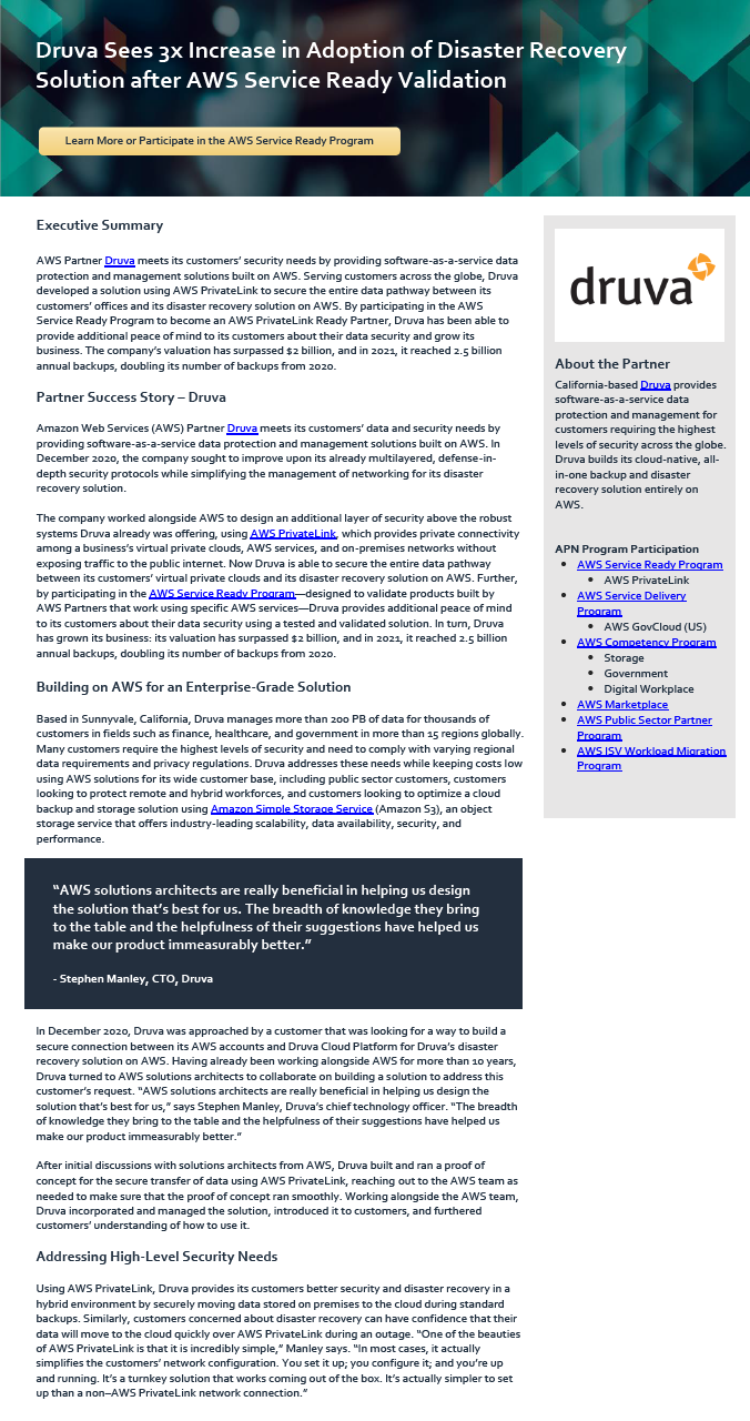 By participating in the AWS Service Ready Program to become an AWS PrivateLink Ready Partner, Druva has been able to provide additional peace of mind to its customers about their data security and grow its business.