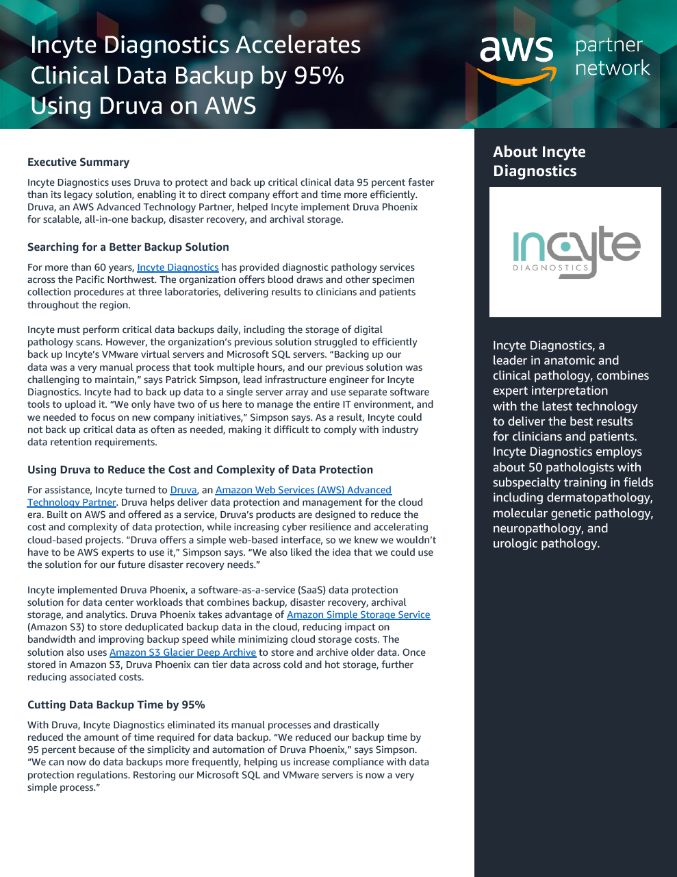 Druva, an AWS Advanced Technology Partner, helped Incyte implement Druva Phoenix for scalable, all-in-one backup, disaster recovery, and archival storage.
