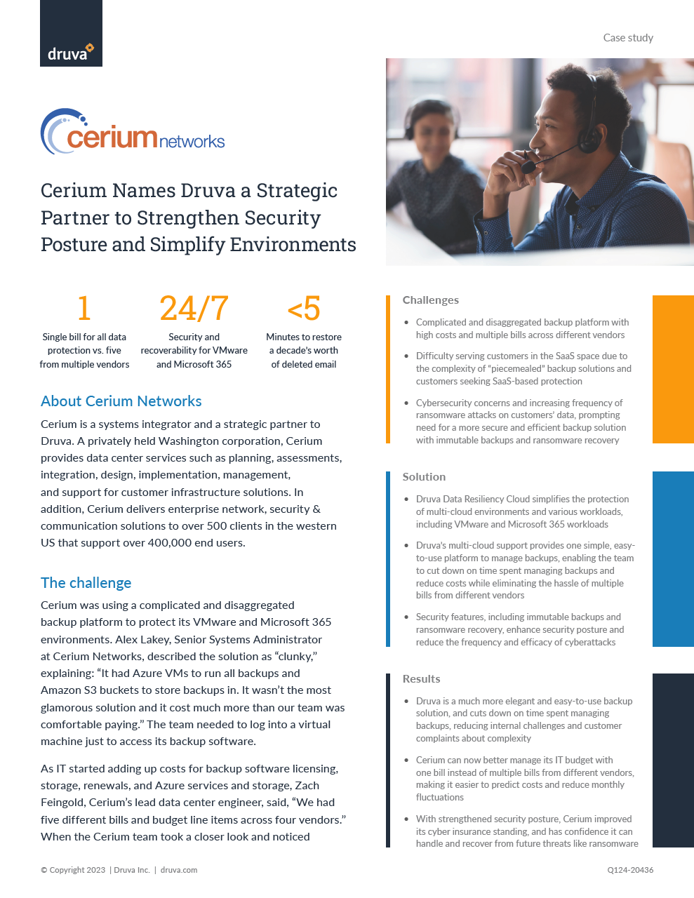 Cerium switched to the Druva Data Security Cloud, which simplified data protection, reduced management time, improved security, and helped cut costs by 25%. Client satisfaction increased, and the team could better manage their IT budget with a consolidated billing system.