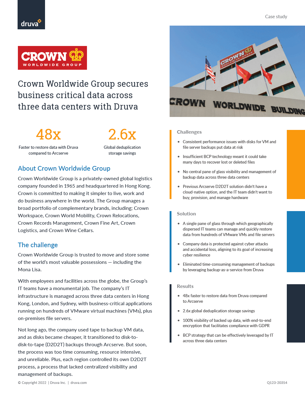 The team can now restore data 48 times faster with Druva compared to its previous Arcserve solution. With centralized backup visibility at the top, each data center team can manage their own backups and take action when needed, while achieving an impressive 2.6x global deduplication storage savings.