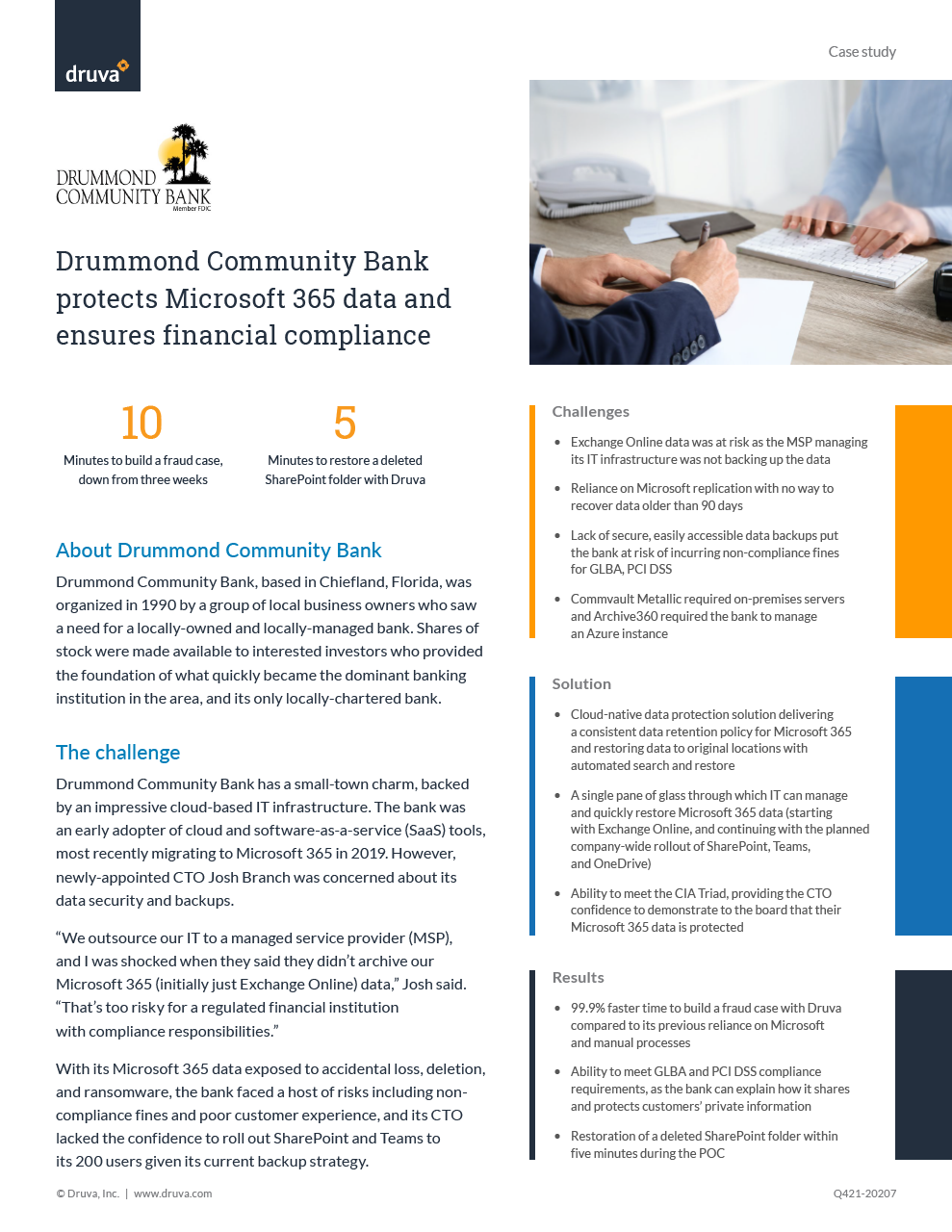 Druva enables the bank to build fraud cases 99.9% faster than legacy solutions, and meet strict industry compliance requirements.