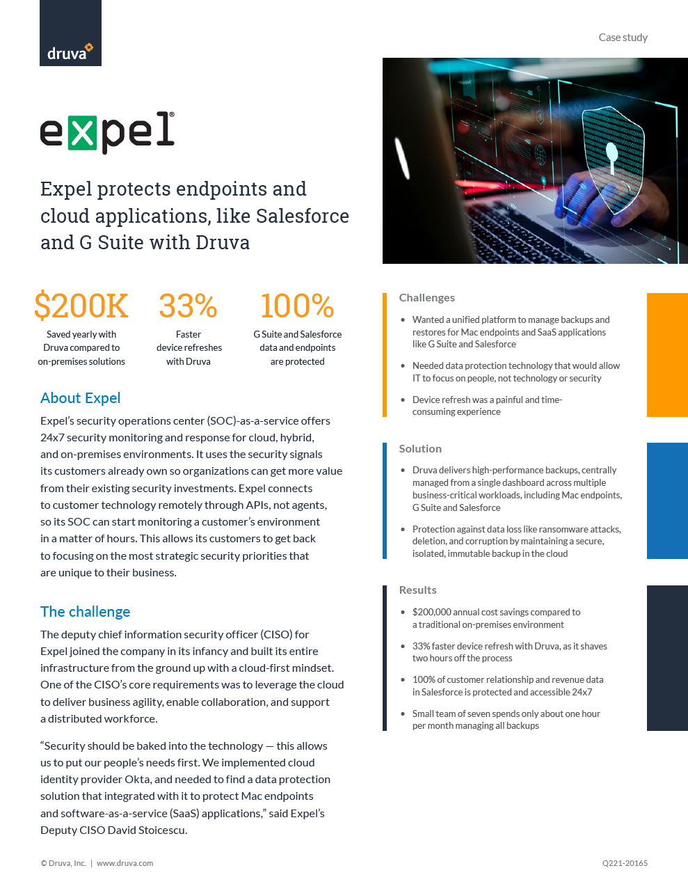 Expel deployed Druva for high-performance backups across multiple business-critical workloads, including Mac endpoints, G Suite, and Salesforce.