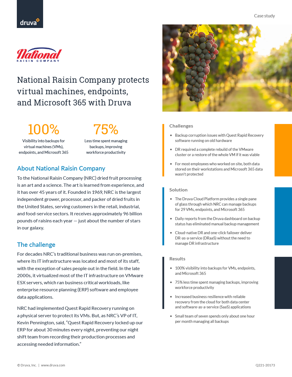 The Druva Cloud Platform gives the National Raisin Company 24x7 access to backups for VMs, endpoints, and Microsoft 365 users.