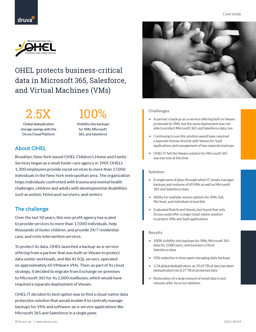 Discover how OHEL Children’s Home and Family Services leveraged Druva to increase backup visibility for VMs, Microsoft 365, and Salesforce — ultimately saving time and costs.