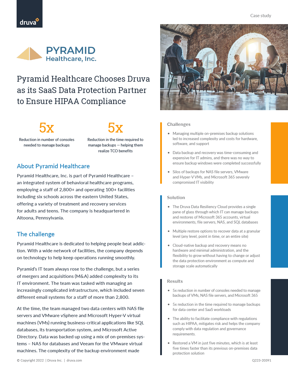 Druva enabled a 5x reduction in time to manage backups for the Pyramid IT team, as well as radically reduced the time to restore VMs, and provided a unified view across all workloads to simplify management of VMs, endpoints, Microsoft 365 data, and more.