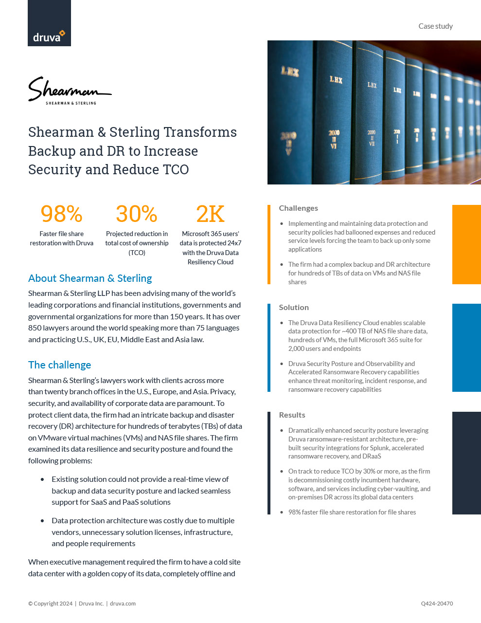 Following deployment and expanding its use of the Druva Data Resiliency Cloud, Shearman & Sterling has been able to enhance its security posture, reduce the costs and complexity of data protection and DR services, and consolidate its data centers.