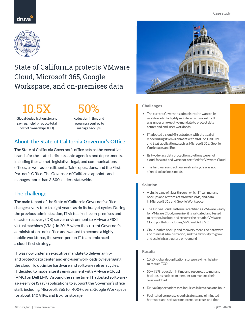 The State of California Governor’s Office leveraged Druva to manage its SaaS application backup, reducing time and management cost, and TCO.