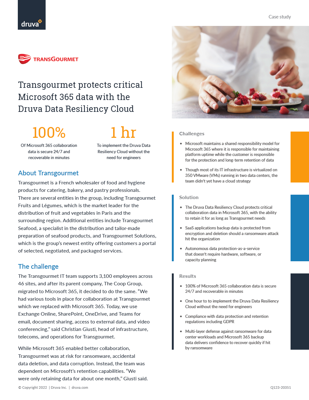 With Druva, the company secures 100% of its Microsoft 365 data 24/7, with clean data recoverable in minutes.