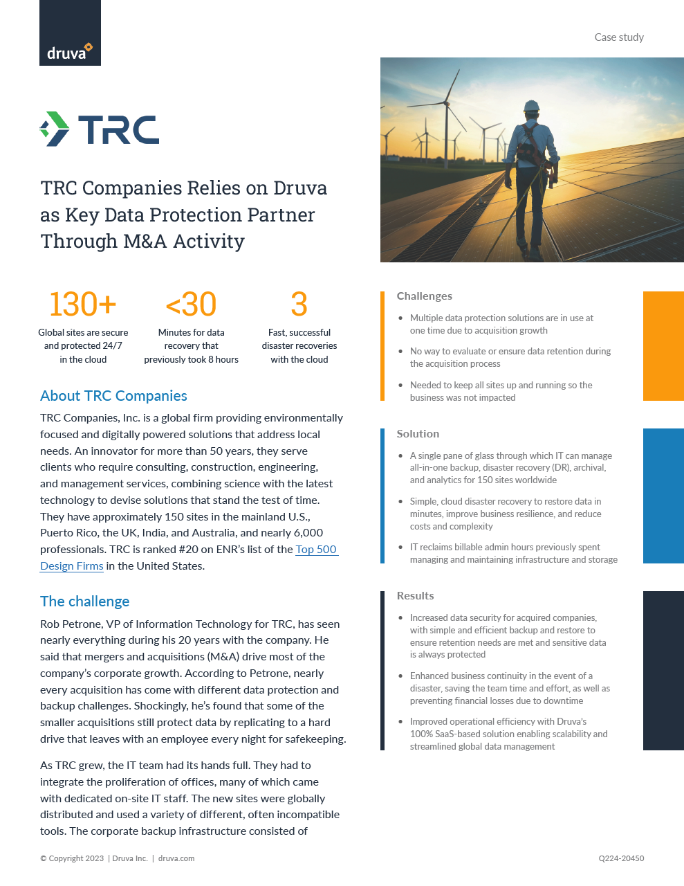 TRC Companies faced data protection challenges due to disparate backup systems. They adopted Druva's cloud-based solution to streamline data management, achieving scalable, single-pane visibility, enhanced security, and efficient disaster recovery. Druva's partnership aided TRC in rapid data