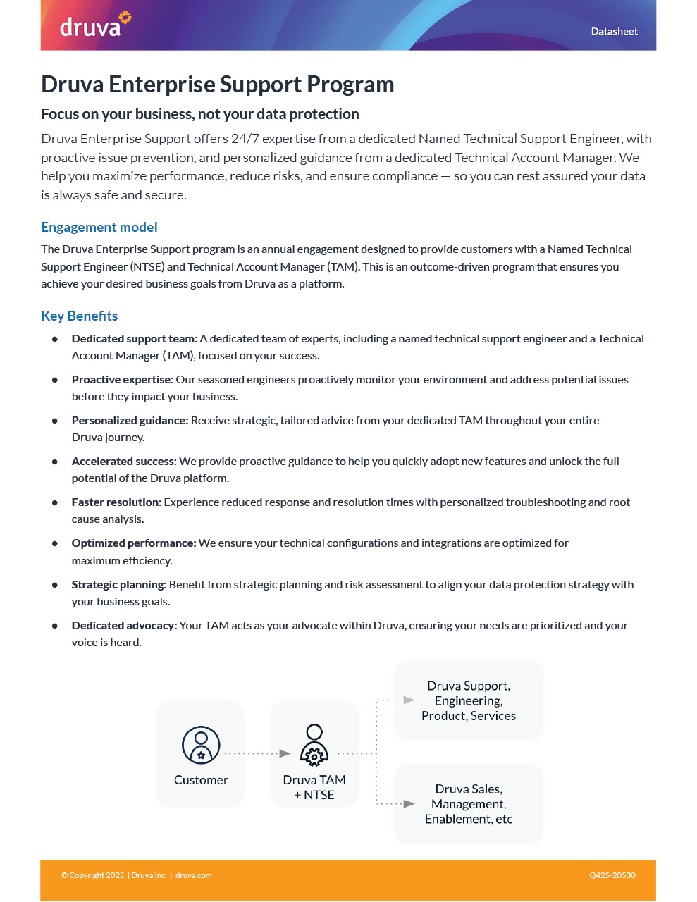 Druva Enterprise Support offers 24/7 expertise from a dedicated Named Technical Support Engineer, with proactive issue prevention, and personalized guidance from a dedicated Technical Account Manager. We help you maximize performance, reduce risks, and ensure compliance — so you can rest assured your data is always safe and secure.