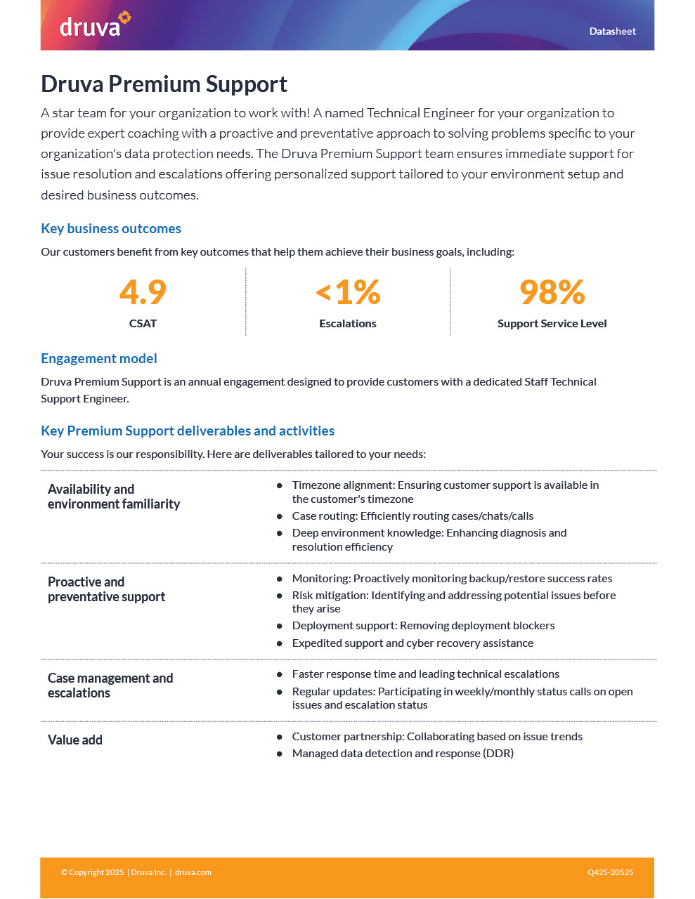 A star team for your organization to work with! A named Technical Engineer for your organization to provide expert coaching with a proactive and preventative approach to solving problems specific to your organization's data protection needs. The Druva Premium Support team ensures immediate support for issue resolution and escalations offering personalized support tailored to your environment setup and desired business outcomes.