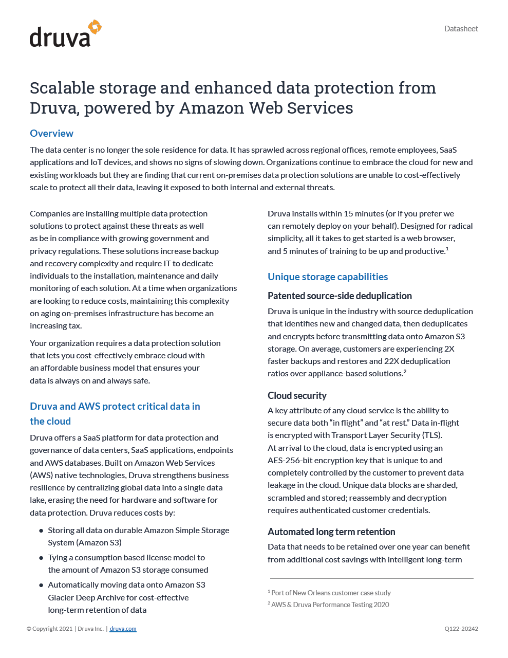 Druva reduces the risk of migrating your data to the cloud with immutable backups stored on reliable Amazon S3 storage.