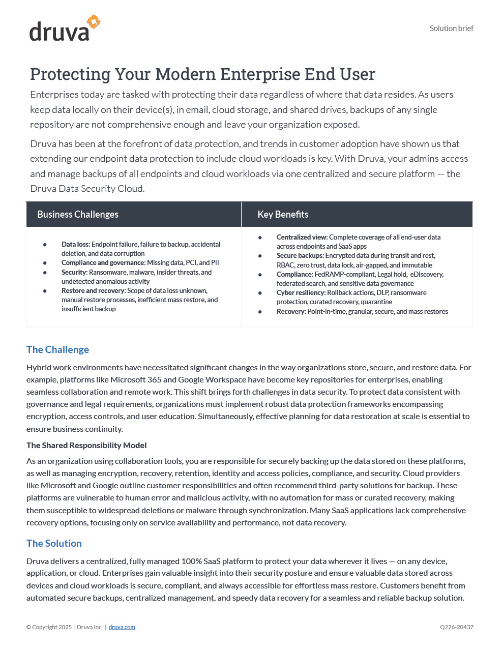 Enterprises today are tasked with protecting their data regardless of where that data resides. As users keep data locally on their device(s), in email, cloud storage, and shared drives, backups of any single repository are not comprehensive enough and leave your organization exposed. Druva has been at the forefront of data protection, and trends in customer adoption have shown us that extending our endpoint data protection to include cloud workloads is key.