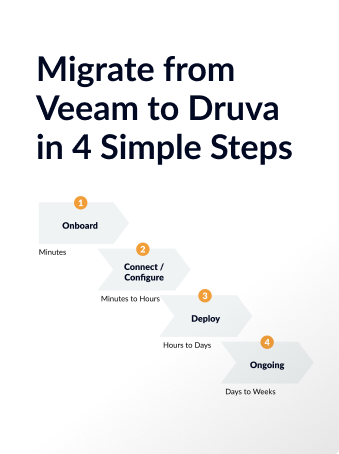 Making the move to Druva from Veeam is easy. Our 100% SaaS-based platform eliminates the challenges associated with both infrastructure management and changing data protection platforms. Many customers are shocked at the speed and ease of switching to a SaaS-based solution.