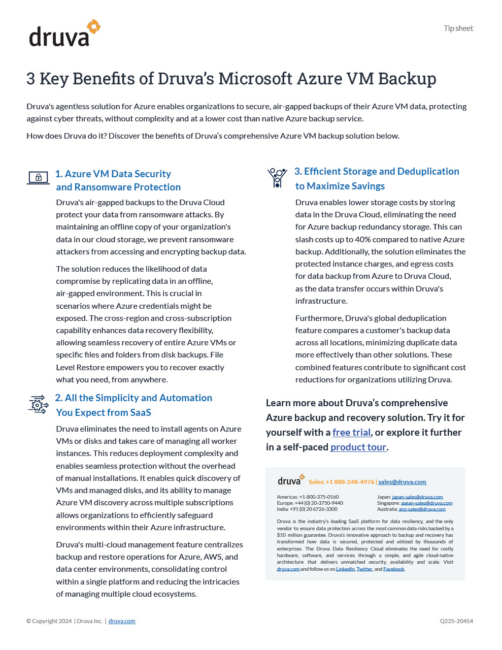 Druva's agentless solution for Azure enables organizations to secure, air-gapped backups of their Azure VM data, protecting against cyber threats, without complexity and at a lower cost than native Azure backup service.