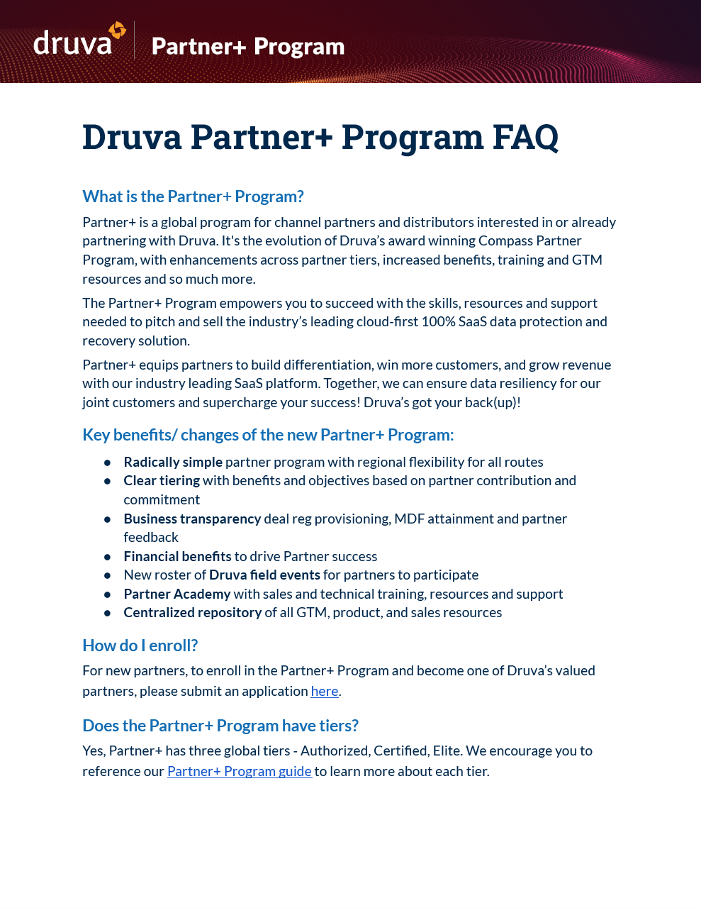 Read the most frequently asked questions and answers about the new Druva Partner+ Program. Partner+ equips partners to build differentiation, win more customers, and grow revenue with our industry-leading SaaS platform.