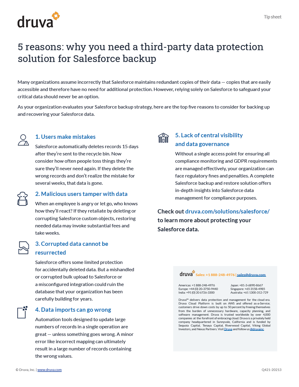 Salesforce does not natively address key concerns about data availability, compliance, and security. Organizations should consider a third-party data protection solution, like Druva, to comprehensively protect Salesforce data.