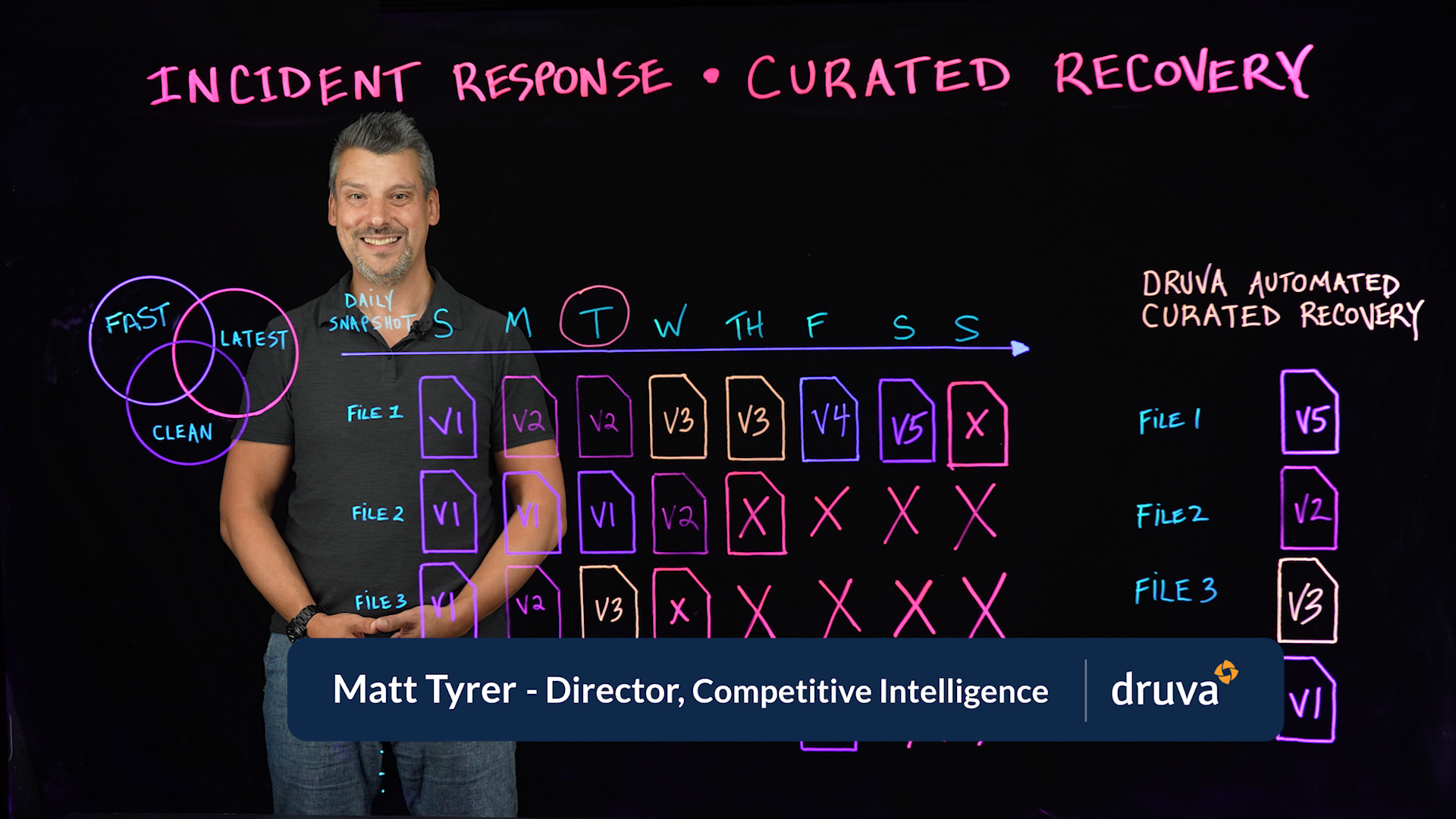 Druva Curated Recovery is capable of quickly, and automatically, stepping back in time through the various backup jobs and extracting only the latest clean copy of the data.