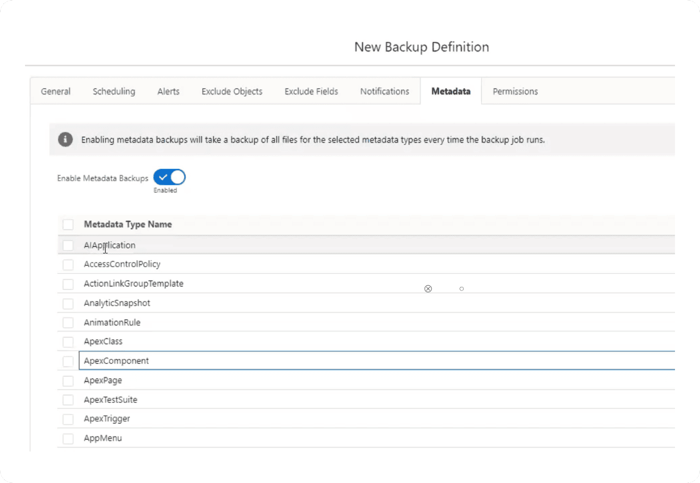 Automate daily backups of data and metadata, for standard, custom, and managed package objects; customize backup and retention frequency.