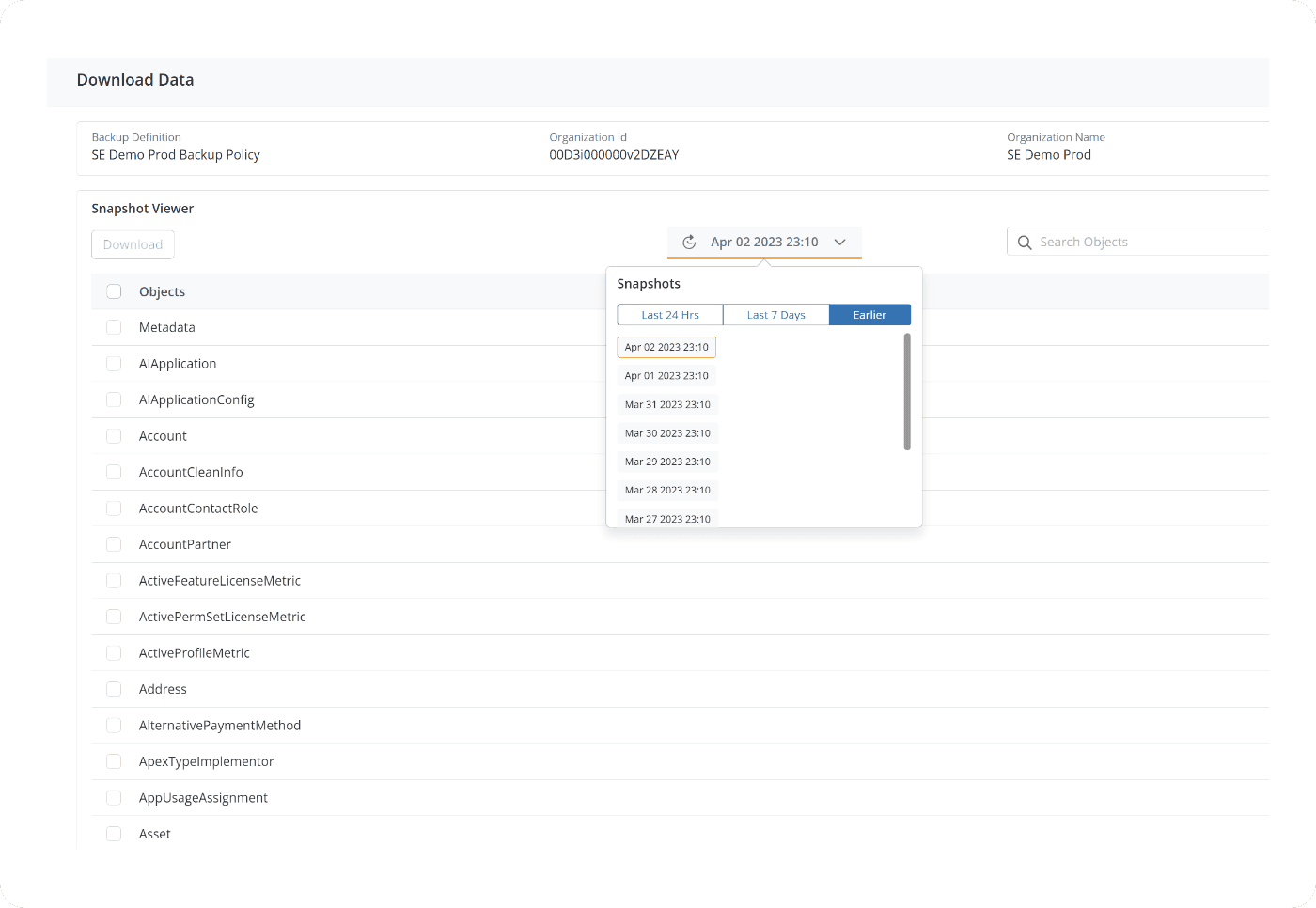Point-in-time restores of data and metadata for entire organizations, objects, records, or specific fields, plus the ability to compare backup files to identify differences.
