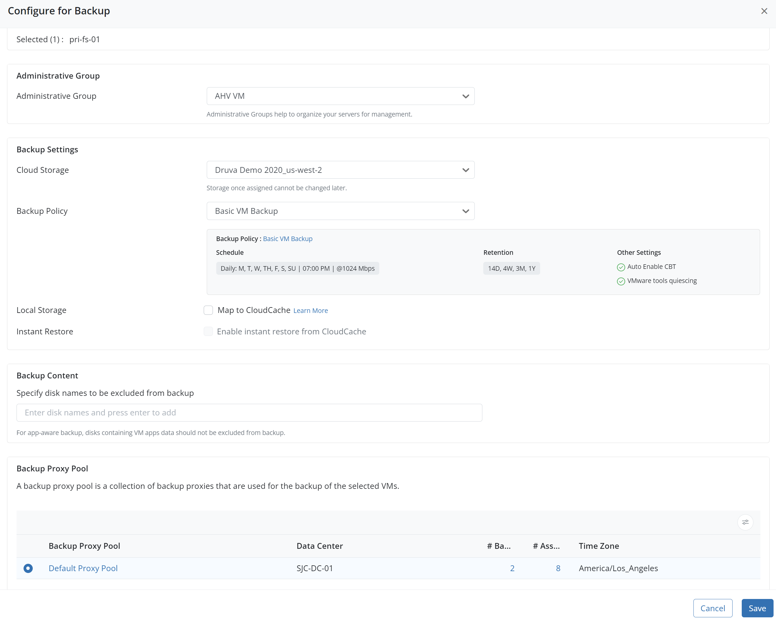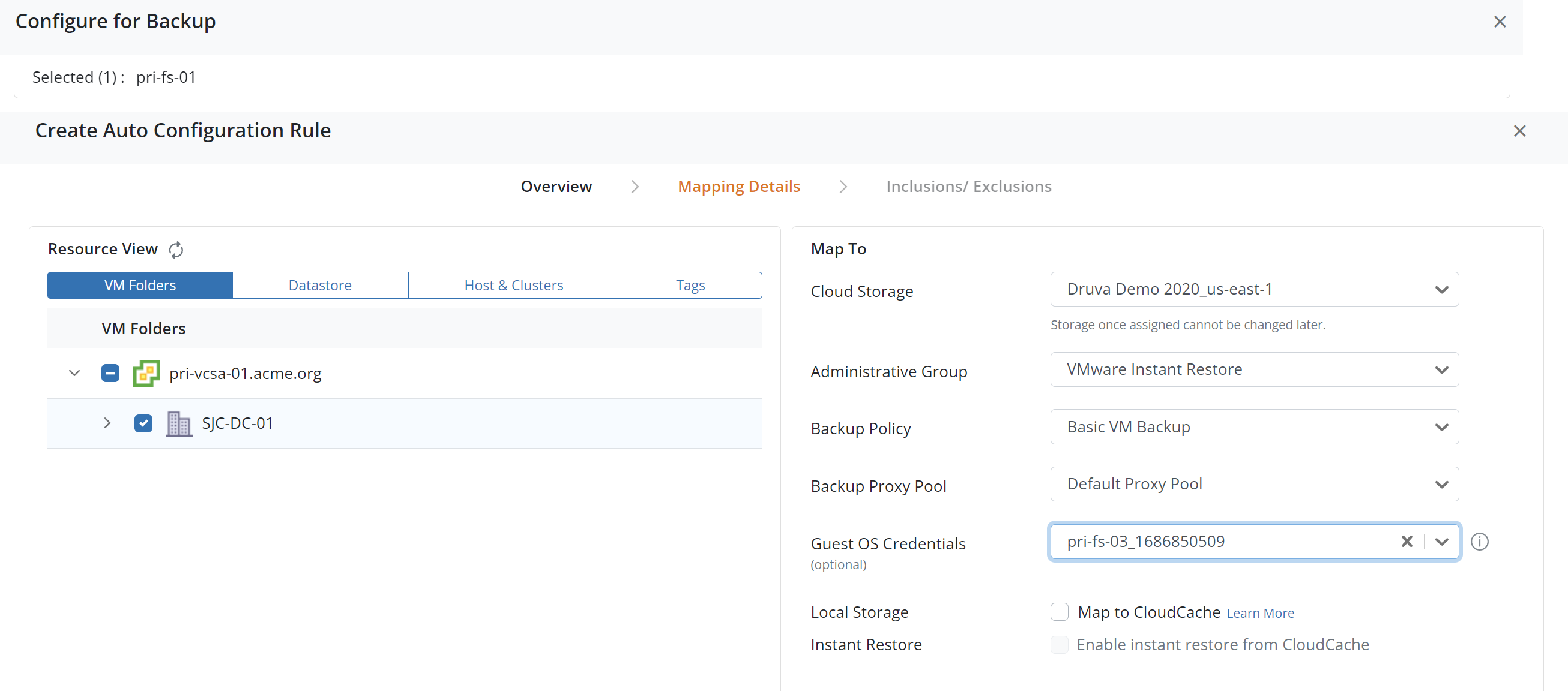 Use Druva auto-configuration rules to identify and protect new VMs based on VM folder, data store, host, and cluster, or tag.