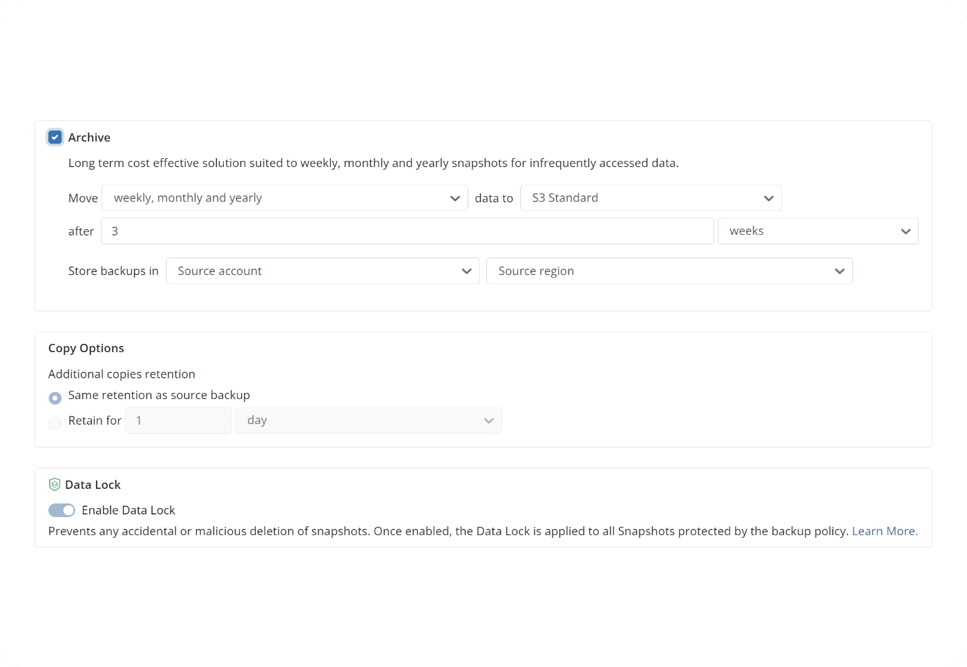 Simplify operations with centralized visibility and control across all Amazon EC2, RDS, S3, and more—and enable global backup policies across regions and accounts.