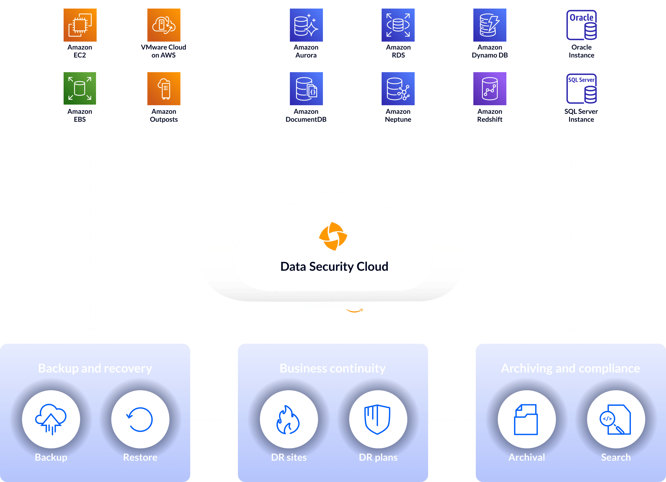 Get immutable, air-gapped backups with agentless protection for Amazon EC2, RDS, and S3. Gain built-in threat hunting, automated quarantine, data lock, anomaly detection, and cyber recovery intelligence.