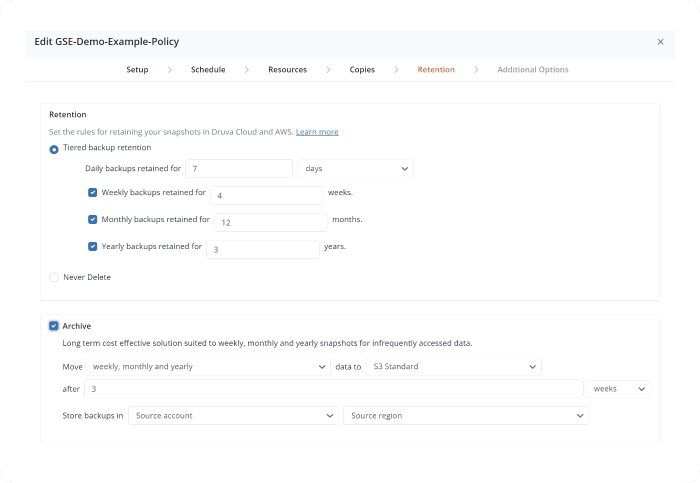 Druva offers the broadest AWS cloud-native coverage with snapshots, immutable backups, cyber resilience, and DR in a unified service. You cut storage costs, gain clear visibility, and secure recovery with backups kept outside your AWS organization. You also get flexible cross-cloud storage that lets you store backup data in Azure for compliance, and added resilience.